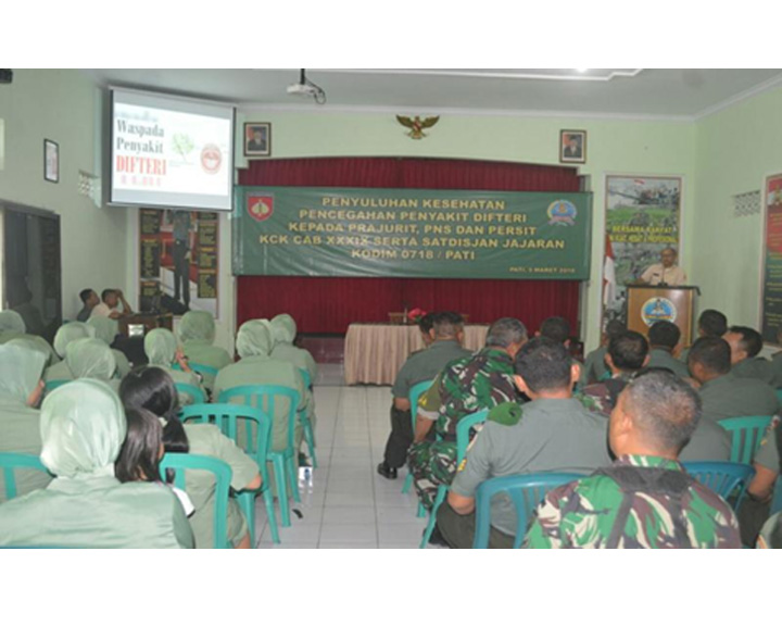 PATI NEWS METRO.CO – Bertempat di Aula Suluh bakti Makodim 0718/Pati, telah diselenggarakan penyuluhan kesehatan pencegahan penyakit difteri kepada Prajurit, PNS, dan Persit KCK Cab XXXIX serta Satdisjan jajaran Kodim 0718/Pati, Senin (5/3/2018).