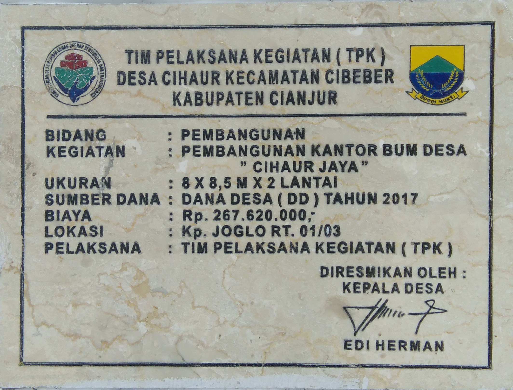 CIANJUR, NEWS METRO.CO – Penggunan nana pembangunan Kantor Usaha Milik Desa (BUMDES) Cihaur yang bersumber dari Dana Desa(DD) tahun 2017 sebesar 267 juta tidak transparan.