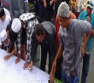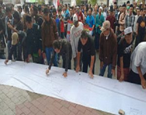 Peserta aksi dari KOMPAK bersama salah seorang anggota DPRD membubuhkan tanda tangan mendukung Pemilu Damai Tahun 2019.
