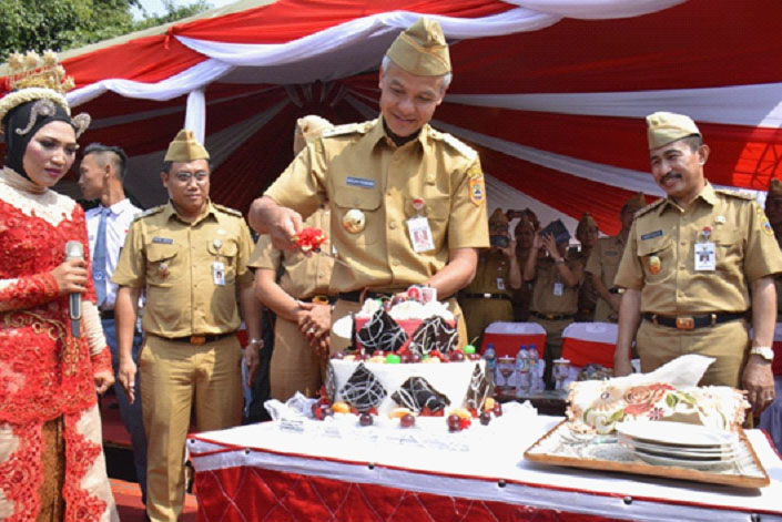 Ganjar memotong kue dan memberikan pada petugas pemimpin upacara hari sumpah pemuda hari ini.