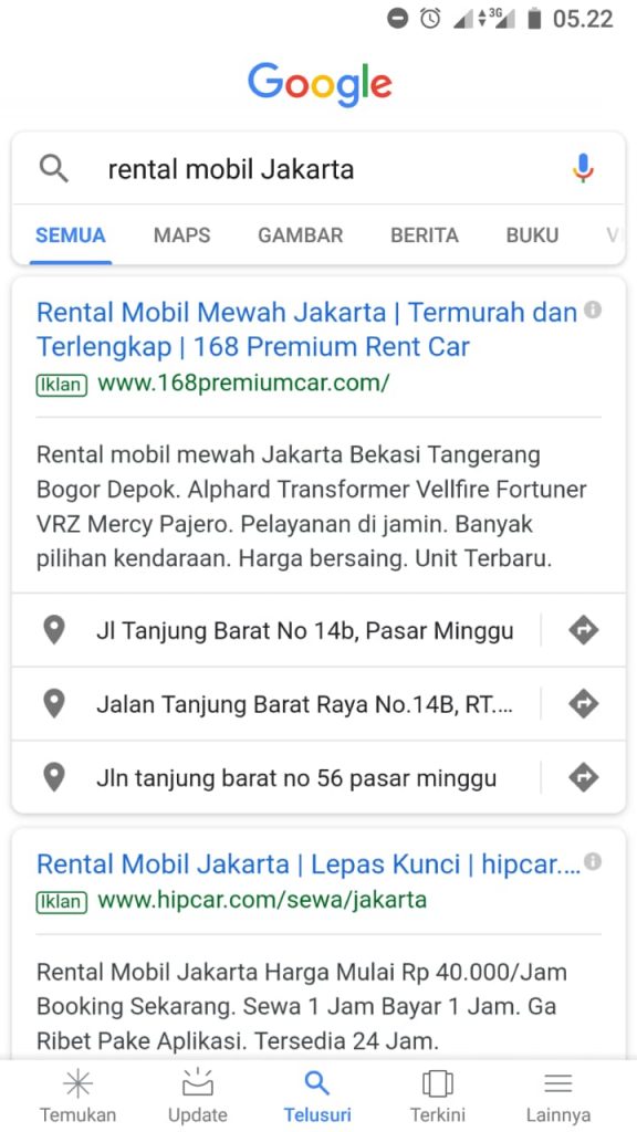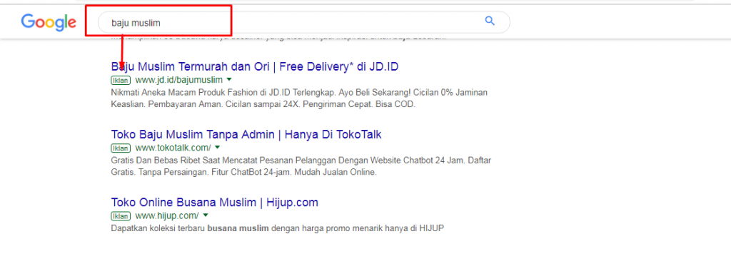 Dibawah ini adalah contoh tampilan iklan di Google Ads. Semuanya menduduki peringkat atas Halaman 1 di Google sesuai kata kunci yang dibidik