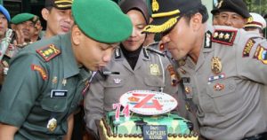 KUDUS NEWSMETRO.CO – Dalam rangka HUT TNI Ke- 74 Tahun Kapolres Kudus AKBP Saptono didampingi Wakapolres, bersama PJU Polres Kudus melaksanakan kunjungan silaturohim di Kodim 0722/Kudus. Tujuan utamanya adalah untuk mengucapkan selamat HUT TNI ke 74 tahun 2019. Serta memberikan kejutan dengan memberikan Kue Tart berbentuk seragam TNI dan tumpeng kepada Letkol Irwansyah Dandim 0722/Kudus. Jumat (4/10/2019) pagi.