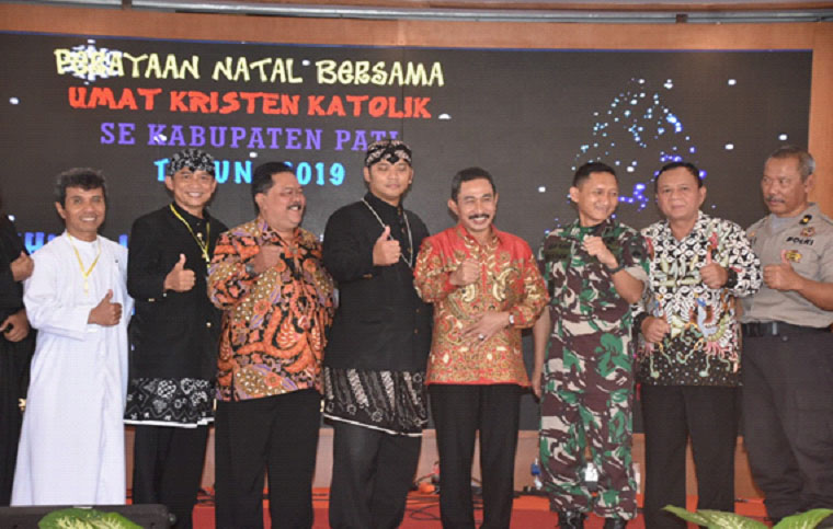 PATI NEWSMETRO.CO – Ribuan umat Kristen dan Katolik dari berbagai wilayah di Kabupaten Pati mengikuti Perayaan Natal Bersama Umat Kristiani yang digelar oleh Badan Kerjasama Kristen Katolik Kabupaten Pati. Perayaan di Pendopo Kabupaten Pati tersebut dihadiri oleh Bupati Pati Haryanto dan jajaran Forkopimda Kabupaten Pati. Jumat, (10/1/2020).