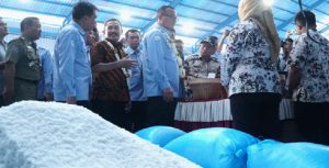 PATI,NEWSMTERO.CO – Kunjungan kerja, Menteri Kelautan dan Perikanan RI Edhy Prabowo, untuk meresmikan enam gudang garam nasional (GGN) yang secara simbolis dilakukan di Desa Sambilawang Kecamatan Trangkil Kabupaten Pati, Kamis 30/1/2020. Keberadaan gudang garam nasional ini untuk menyimpan garam hasil produksi petambak garam. Pengelolaan gudang garam nasional tersebut dilakukan oleh koperasi garam di masing-masing sentra garam rakyat.
