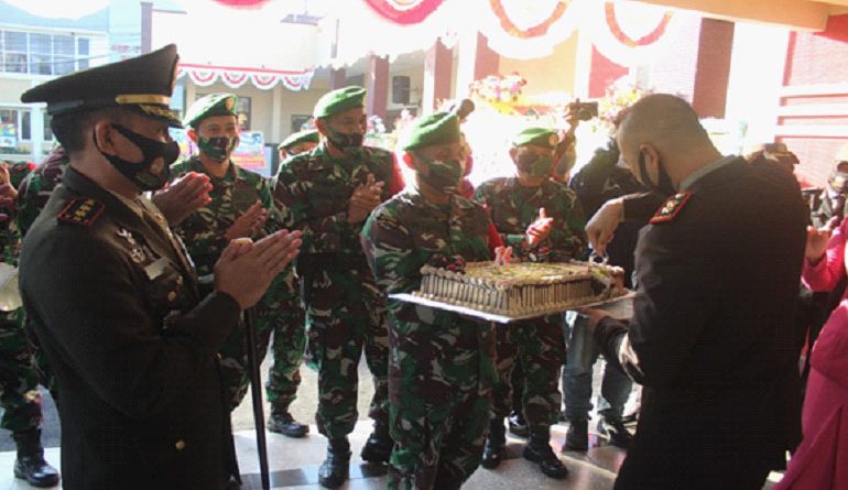 Dalam kegiatan perayaan momentum ulang tahun Coprs Bhayangkara pagi tadi pukul 07.05 wib dikejutkan oleh rombongan TNI dari Kodim 0718 Pati dipimpin oleh Komandan Kodim 0718 Pati Letkol Czi Adi Ilham Zamani, SE, M.I.POL bersama perwakilan Danramil serta Perwira Staf Kodim Pati dengan membawa kue ulang tahun serta dengan pengeras suara menyanyikan lagu ulang tahun yang tiba-tiba masuk ke Markas Polres Pati. Rabu, 01/07/2020.