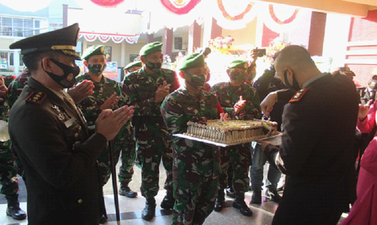 Dalam kegiatan perayaan momentum ulang tahun Coprs Bhayangkara pagi tadi pukul 07.05 wib dikejutkan oleh rombongan TNI dari Kodim 0718 Pati dipimpin oleh Komandan Kodim 0718 Pati Letkol Czi Adi Ilham Zamani, SE, M.I.POL bersama perwakilan Danramil serta Perwira Staf Kodim Pati dengan membawa kue ulang tahun serta dengan pengeras suara menyanyikan lagu ulang tahun yang tiba-tiba masuk ke Markas Polres Pati. Rabu, 01/07/2020.