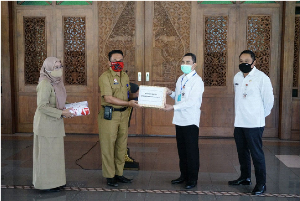 PATI, NEWSMETRO.CO – Bupati Pati selaku Ketua Gugus Tugas Percepatan Penanganan Covid-19 kembali menyalurkan bantuan dari produk UMKM berupa makanan ringan kepada tenaga kerja medis di rumah sakit negeri maupun swasta di Pendopo Kabupaten Pati. Bantuan berupa makanan ringan, madu yang dikerjakan oleh kelompok UMKM dan masker non medis diserahkan kepada perwakilan rumah sakit di Kabupaten Pati. Senin (27/7/2020).
