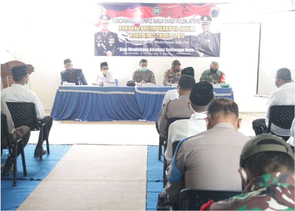 PATI, NEWSMETRO.CO – Pondok Pesantren (Ponpes) Tahfidz Yanbu’ul Qur’an Boarding School 1 Pati yang terletak di Jl.Raya Pati -Tayu Km.6 Ikut Ds. Sukoharjo Kec. Wedarijaksa Kab. Pati, dicanangkan sebagai Pondok Pesantren Siaga Candi Polres Pati, Rabu (05/08/2020).Kegiatan pencanangan Ponpes Siaga Candi tersebut dipimpin oleh Kapolres Pati yang diwakili oleh KAur Bin Ops Sat Binmas, Muspika Kecamatan Wedarijaksa.