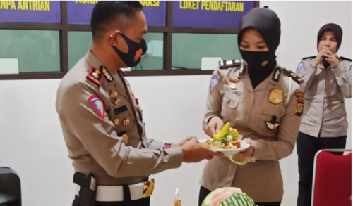 Kasat Lantas Kota Depok, Kompol Erwin Aras Genda (Kiri) menerima Tumpeng dari seorang Polwan dalam acara selamatan Satpas Cinere Senin (7/9/2020).DEPOK, NEWSMETRO.CO – Semenjak Kasat Lantas Kota Depok dijabat Kompol Erwin Aras Genda Selasa (19/5/2020) lalu, Perwira lulusan Akpol 2003 ini berhasil memberantas puluhan calo di Satpas 1221 Gedung Pasar Segar, Jalan Toleiskandar Kota Depok, padahal sebelumnya puluhan calo yang tiap hari gentayangan di areal parkiran Satpas tersebut, sulit dibasmi.