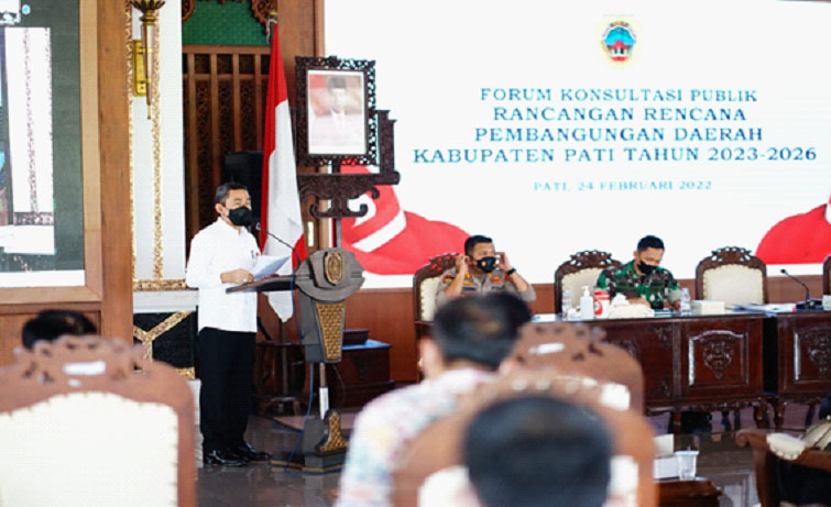 PATI-NEWSMTERO.CO – Bupati Pati Haryanto menyebut bahwa kemajuan pembangunan di daerah, tidak hanya dipandang dari sudut pembangunan infrastruktur saja melainkan dilihat juga perlu ditinjau dari secara makro. Hal tersebut ia sampaikan dalam Forum Konsultasi Publik Rancangan Rencana Pembangunan Daerah (RPD) tahun 2023 – 2026 di Pendopo Kabupaten Pati, Kamis (24/2/2022).