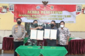 Acara ditutup dengan penandatanganan naskah serah terima TMMD, penandatanganan prasasti serta penyerahan bantuan secara simbolis dari instansi terkait. (HADI/TIM)