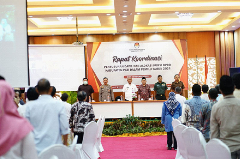 PATI.NEWSMETRO.CO – Komisi Pemilihan Umum (KPU) Kabupaten Pati, menggelar rapat koordinasi penetapan Daerah Pemilihan (Dapil) dan alokasi kursi DPRD, di Hotel New Merdeka, Rabu (23 /11/ 2022).
