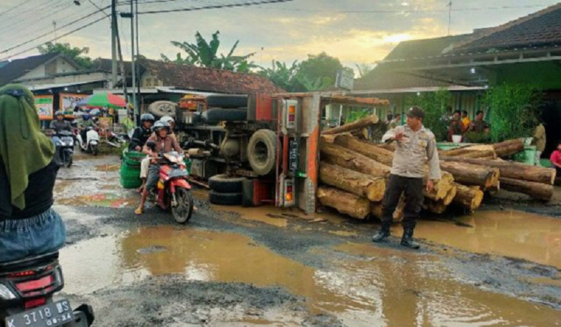 Jalan Berlubang, Truk Bermuatan Kayu Terguling di Jalan Tlogowungu Pati