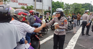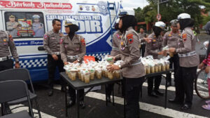 PATI. OBSERVASI FAKTUAL.COM – Momentum bulan suci ramadhan, Satlantas Polresta Pati melakukan kegiatan membagikan takjil kepada pengguna jalan yang melintas untuk berbuka puiasa. Dalam kegiatan baksos ini yang dilakukan dibawah kepemimpinan Kompol Asfauri, S.H., M.H., Senin (27/3/2023).